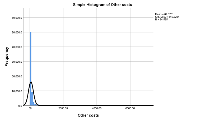 Figure 2 is a histogram that shows the other costs. The mean of the data for other costs(cost of land) is 67.87, with a standard deviation of 145.52. The range of the data for other costs is 6856. It can be observed that ‘other costs’ is not normally distributed, there is some positive skewness in the data.