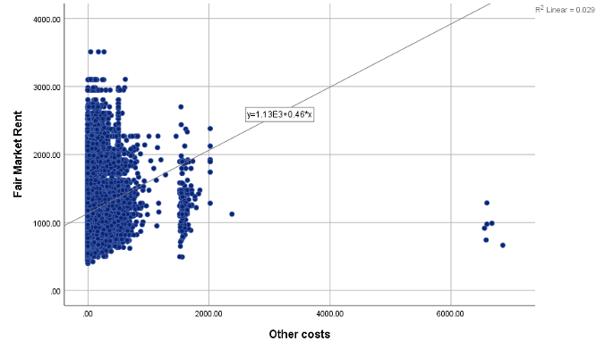 Figure 5 is a scatterplot that shows the relationship between the number of persons in the household and the fair market rent. It can be observed that there is a moderately strong positive correlation between the cost of land (other costs) and the fair market rent.